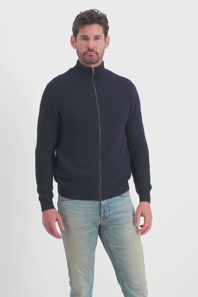 A contemporary twist on a menswear staple, this Men’s Bomber-Style Cashmere Cardigan combines the comfort of a knit with the distinctive edge of a jacket. Crafted in a textured intrecciato basket knit, it offers rich texture, effortless layering, and refined style. With a polished silhouette and versatile design, this piece bridges casual ease and elevated sophistication, making it a standout addition to any modern wardrobe.
